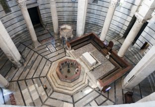 Gleich neben dem Schiefen Turm von Pisa steht ein weiteres Gebäude, was an Einmaligkeit im Abendland nicht überboten wird - die größte Taufkapelle der Christenheit. 54 Meter Höhe und 107 Meter Umfang misst das Gebäude. Das Innere beeindruckt mit dem aus dem Jahre 1246 von Guido Bigareli da Como geschaffenen achteckigen Taufbecken und dem Kanzelbecken. Das Kanzelbecken ruht auf sieben Säulen und ein Adler trägt das Lesepult. Wenn Sie Lust haben, begeben Sie sich nach oben und besteigen Sie das Kuppeldach!